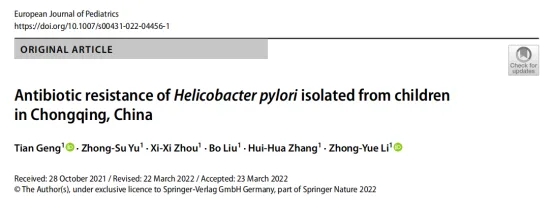近期,重慶醫科大學附屬兒童醫院消化科主任李中躍老師課題組在歐洲兒科醫學期刊《European Journal of Pediatrics》上發表Antibiotic resistance of Helicobacter pylori isolated from children in Chongqing, China的研究論文,研究團隊對重慶地區兒童幽門螺桿菌耐藥性進行了分析。